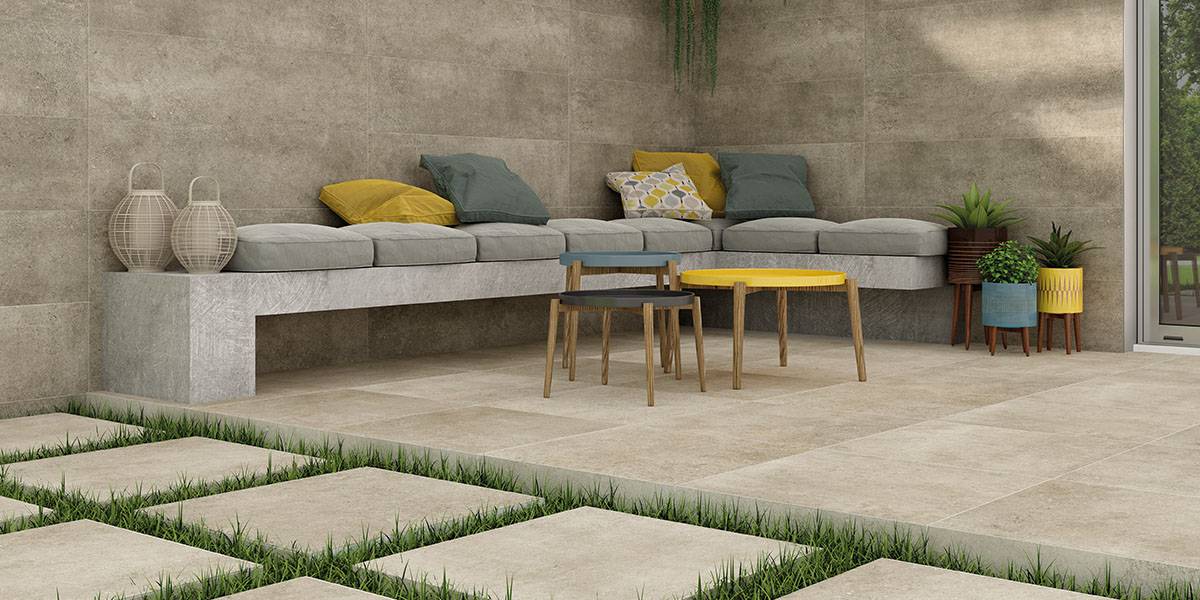 Carrelage en grès cérame 2 cm d'épaisseur d'une usine espagnole R11, disponible en 4 couleurs : Taupe, Grafito, Perla et Marfil sous les formats 76x76 et 61x61