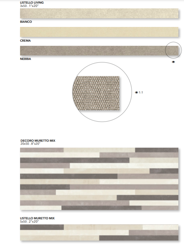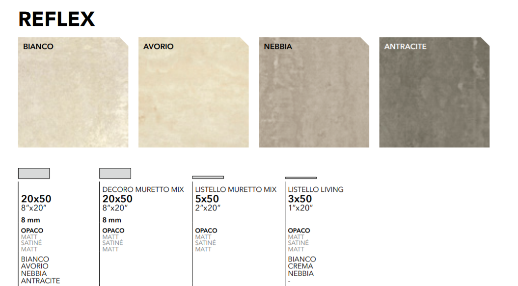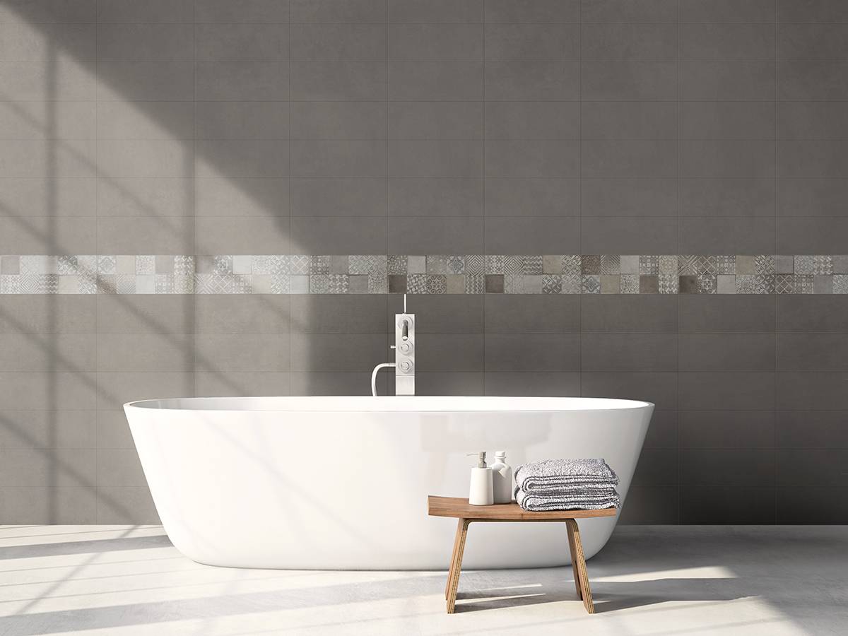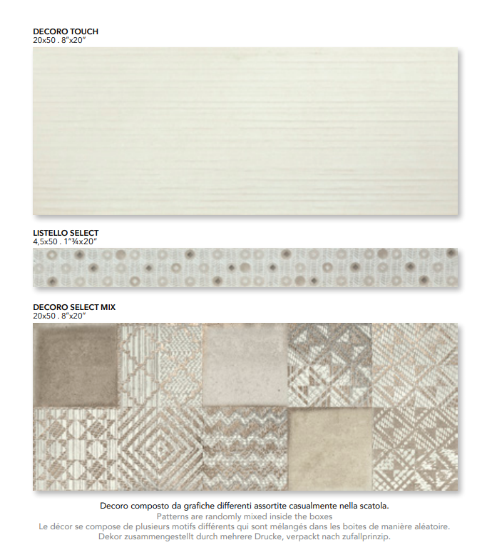Des motifs géométriques de style ciment et des bandes complètent la série SELECT, format 20x50 cm, conçue par les italiens pour compléter la gamme de sols Select, en grès cérame, avec une ambiance contemporaine.